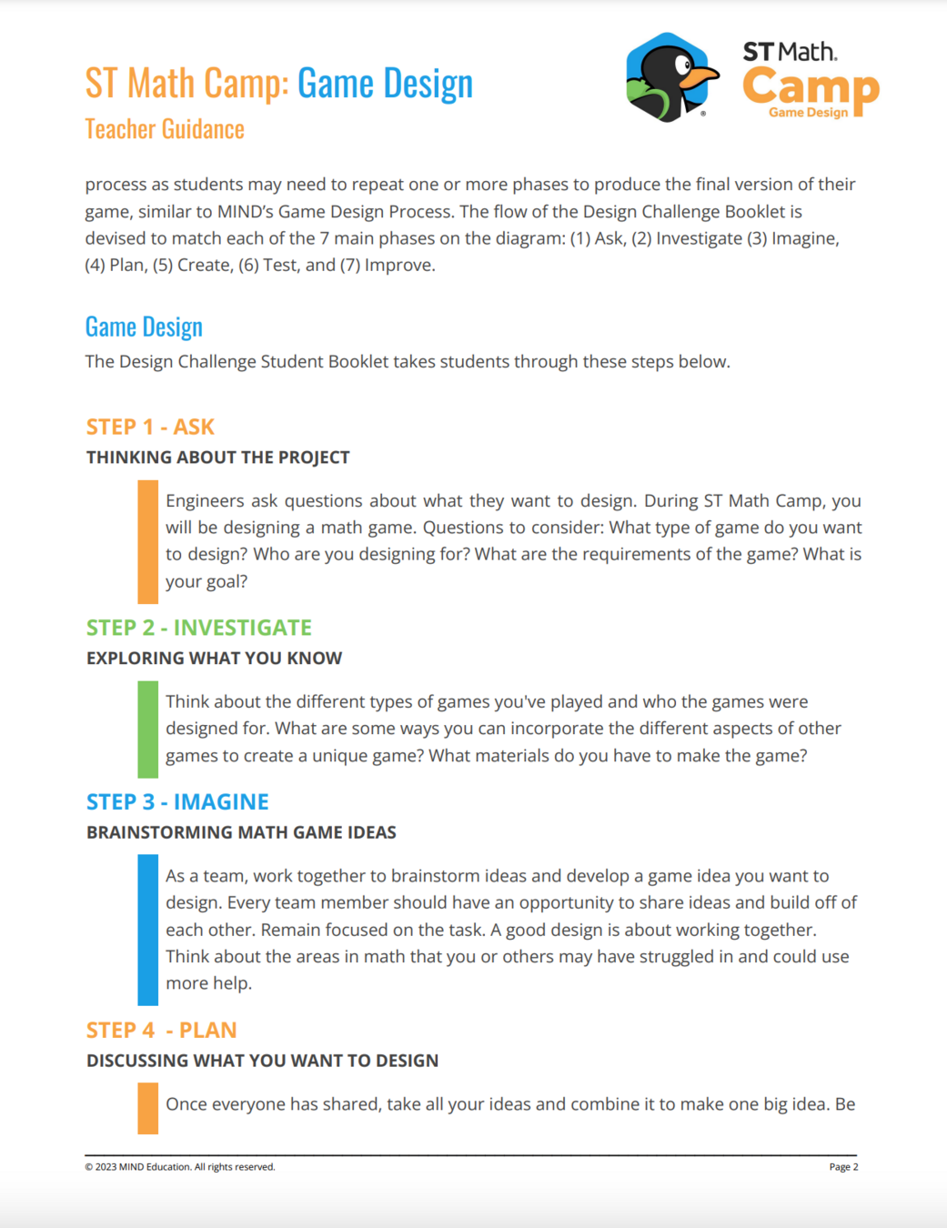 The Design Process Description provides a seven-step description of the design process and how students use it to proceed through the creation of their individual ST Math Game Design Camp game.
