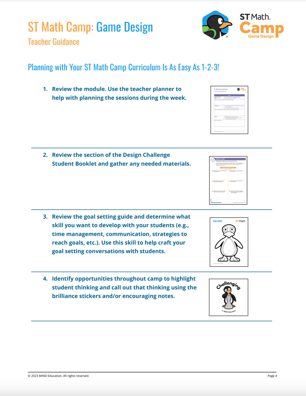 Planning with your ST Math Camp curriculum can be as easy as 1-2-3...and 4, thanks to the Teacher Guidance resource. Teacher Guidance focuses on preparing teachers to successfully facilitate discussion and learning through the Design Process. Along with this guidance, the resource provides an at-a-glance planning guide for facilitators.