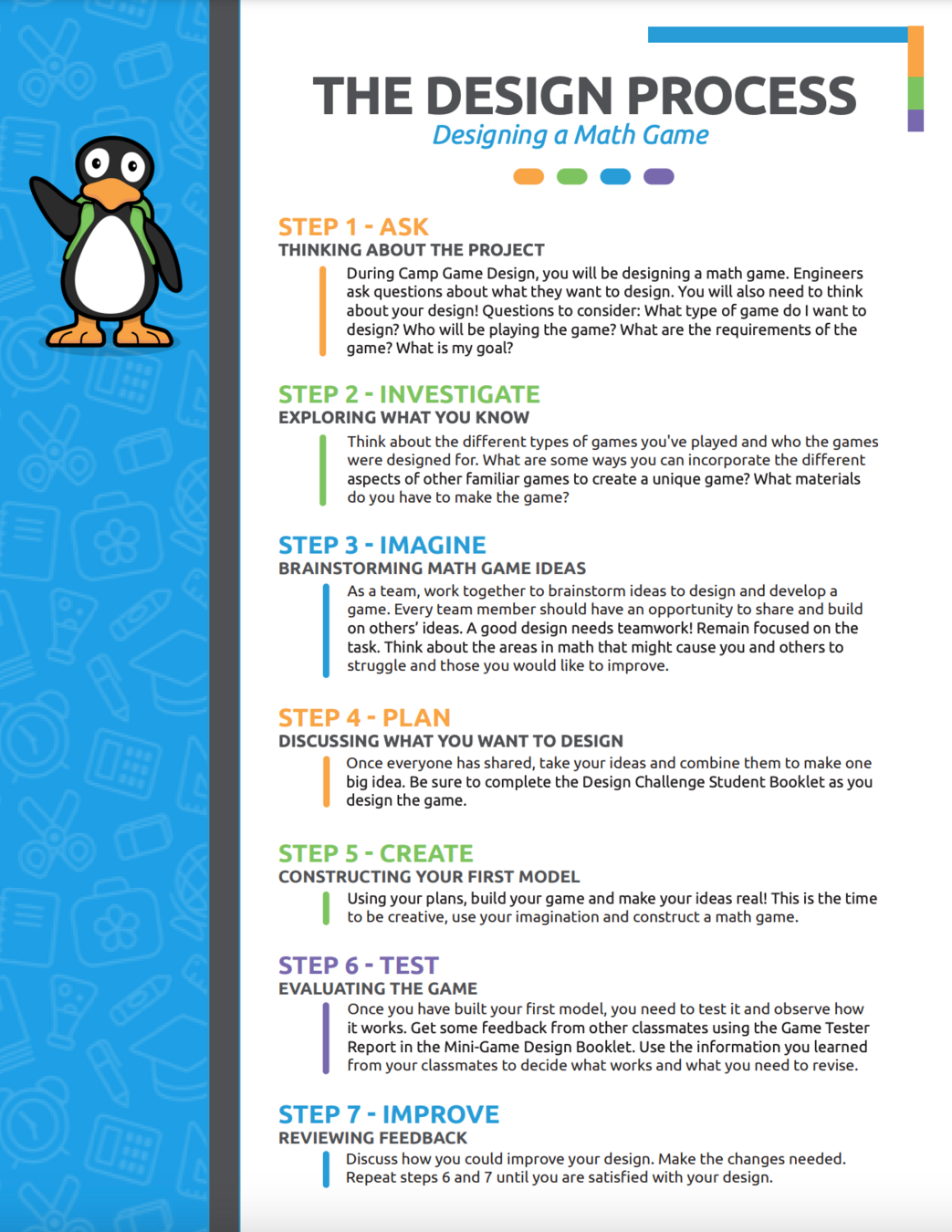 The Design Challenge Student Booklet includes a list of requirements and a game planner that students will use in this part of the process.