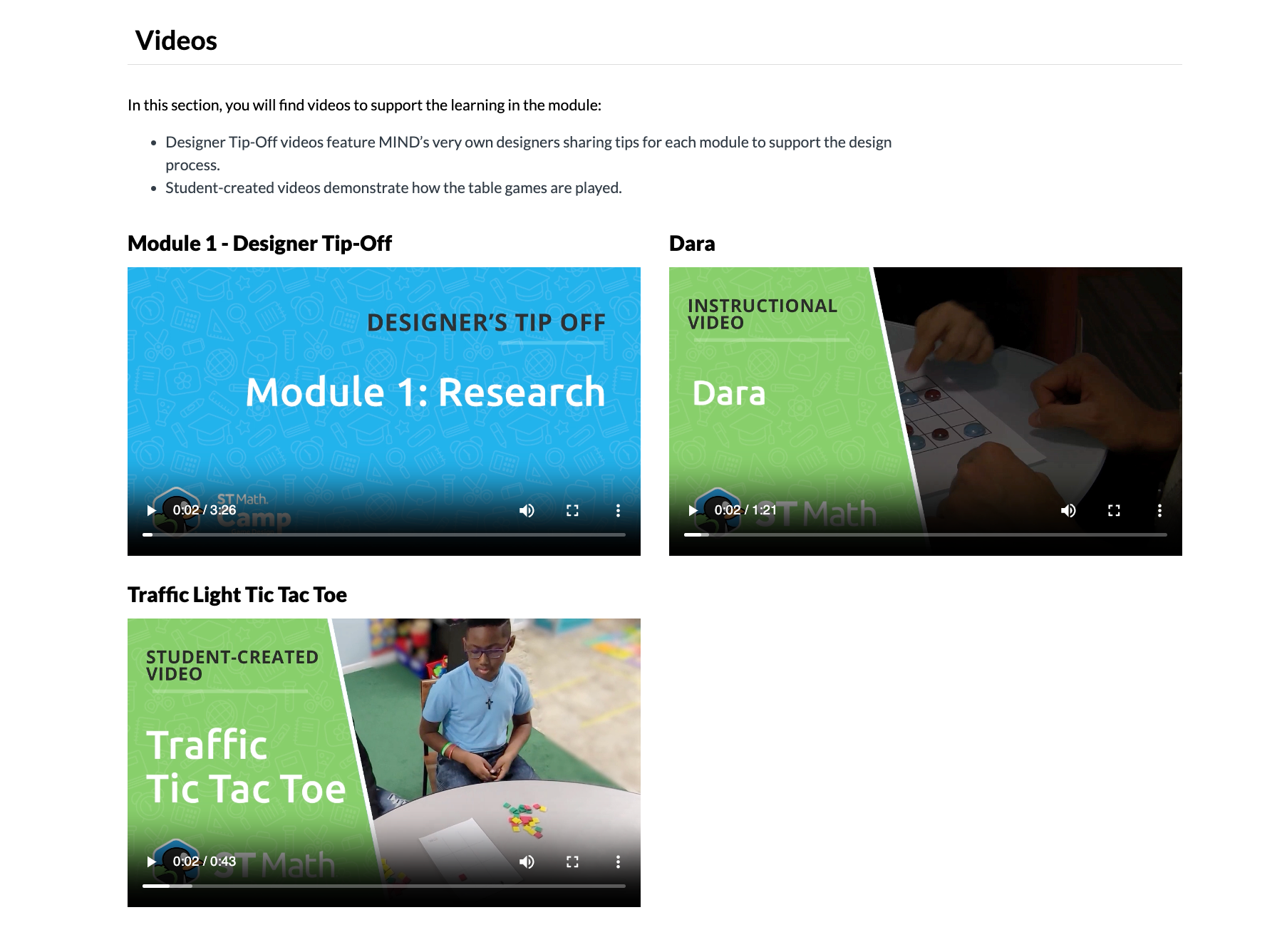In this section, you will find videos to support the learning in the module. Designer Tip-Off videos feature MIND’s very own designers sharing tips for each module to support the Design Process. The Student-Created Videos provide students and teachers with a firsthand look at the table games included in the ST Math Game Design Camp.