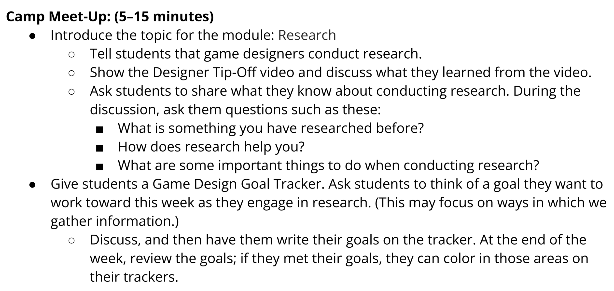 The Goal Setting Guide provides information on how to help students track their progress in the goals that they set at the beginning of the module using the Game Design Goal Tracker. As students reach their goals, they can color the corresponding areas on their sheets.