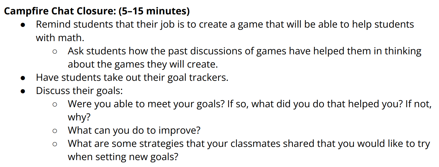Each session of the ST Math Game Design Camp ends with a Campfire Chat. This 5-15 minute closing is a time to guide students further into the design process. Ending the session with a conversation about their experiences in that session, how those experiences connect to previous sessions, and how it applies to their game design process is a great way to bring closure to the session.