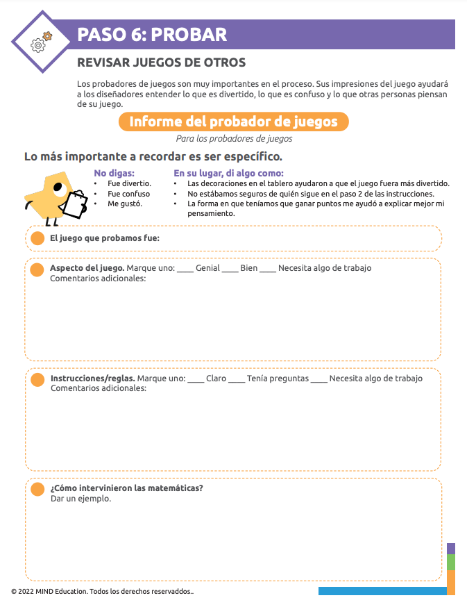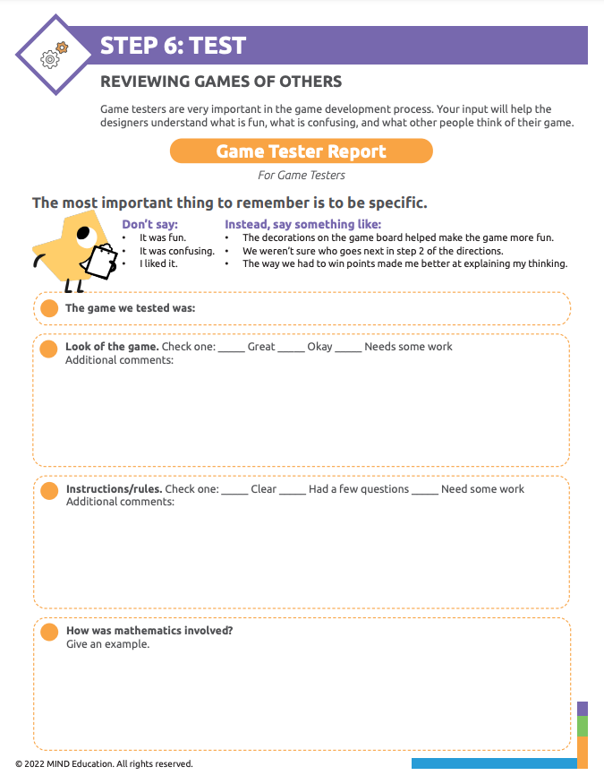 Once students have built their first model, they will test it and see how it works. Classmates use the Game Tester Report to give the designer feedback. The information from the classmates will help students to decide what works and what needs to be changed.