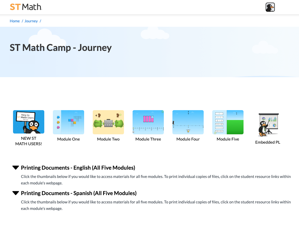 ST Math Camp consists of five modules, with five sessions in each module. New ST Math users have an extra module designed just for them! Each Journey Module contains module plans, support resources, helpful videos, and more!
