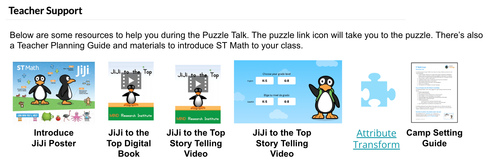 To learn ST Math like a pro, you first need to get to know Jiji the Penguin! The Teacher Support section includes three great resources that can help you do just that. Click on each image below to access the resource.