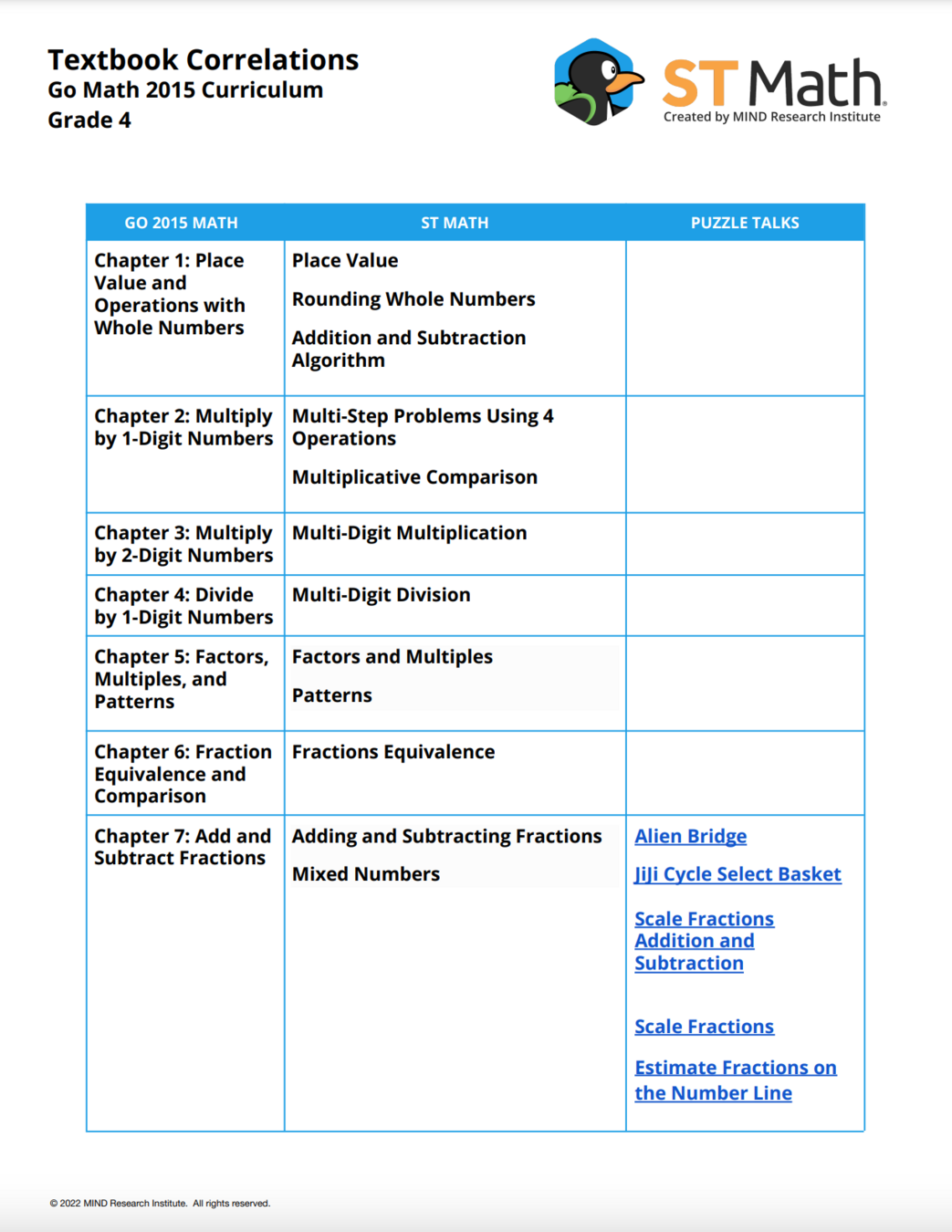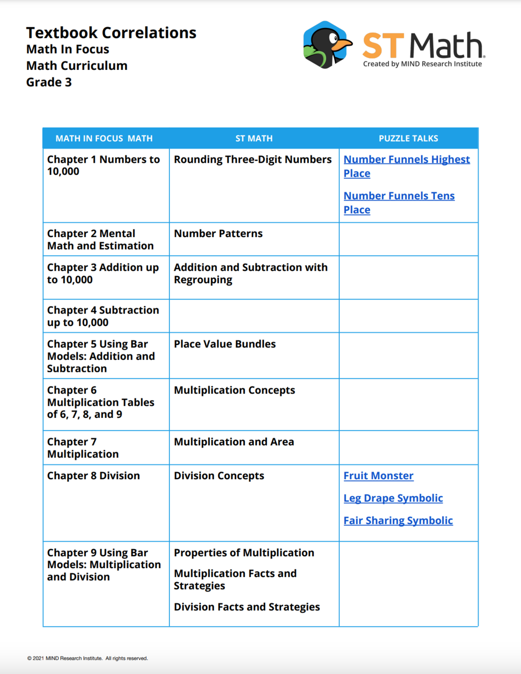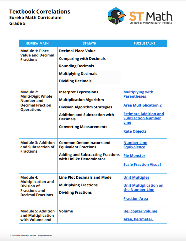 ST Math textbook correlations show the teacher which ST Math Puzzle Talk matches this unit and topic.