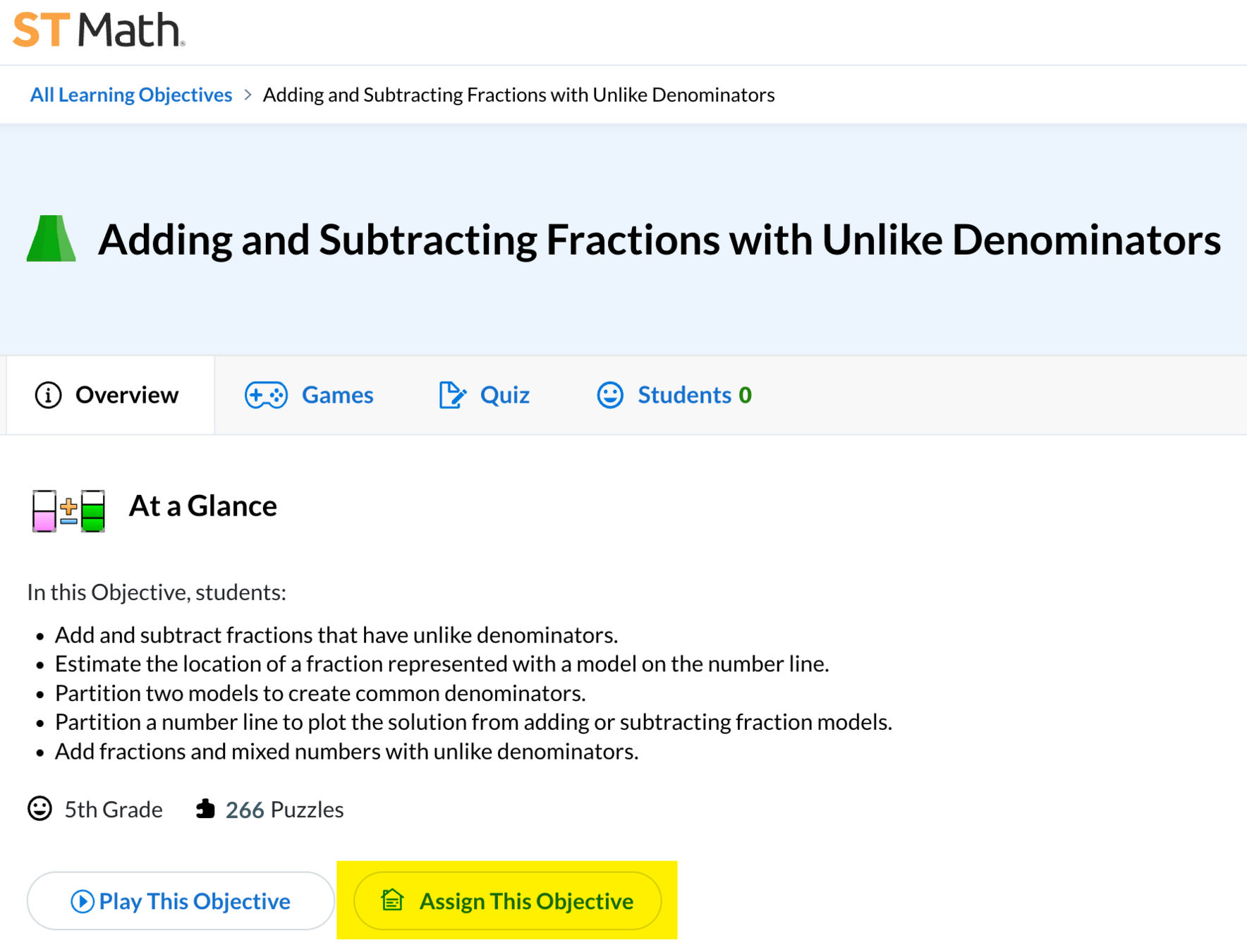 - Look for ST Math objectives and puzzles with content related to classroom objectives to stretch student thinking