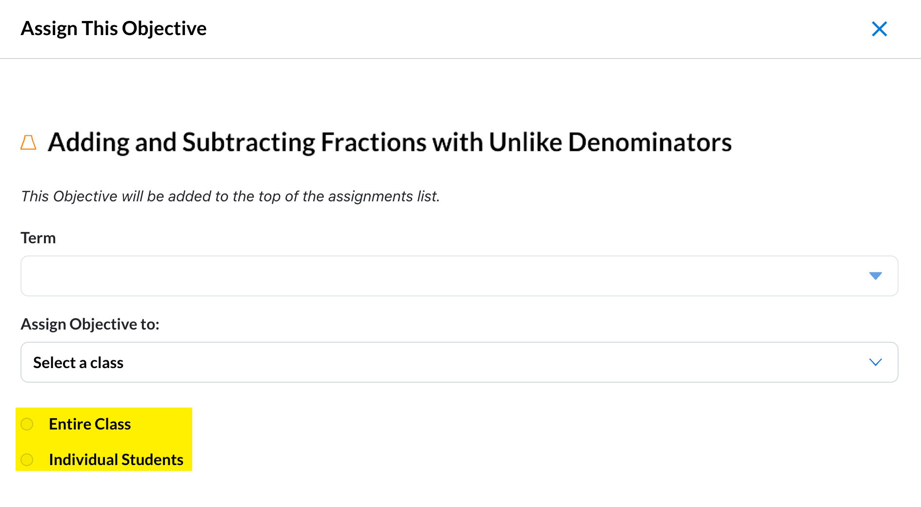 ST Math textbook correlations show the teacher which ST Math objective matches this unit and topic. Then the teacher can assign the ST Math objective to the whole class, or to individual students, for review.
